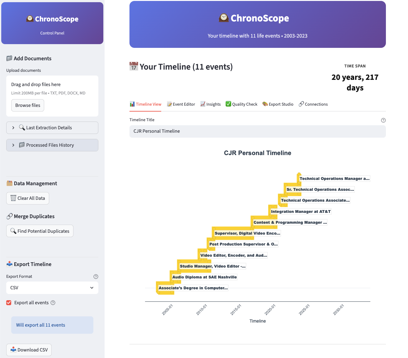 ChronoScope uses AI to extract career events from resumes and documents, creating interactive timelines for portfolios, job applications, and career retrospectives.